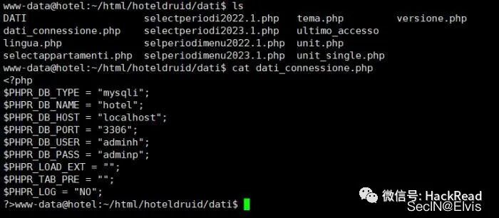 在/html/hoteldruid/data下的dati_connessione.php文件,找到了mysql的连接账号密码