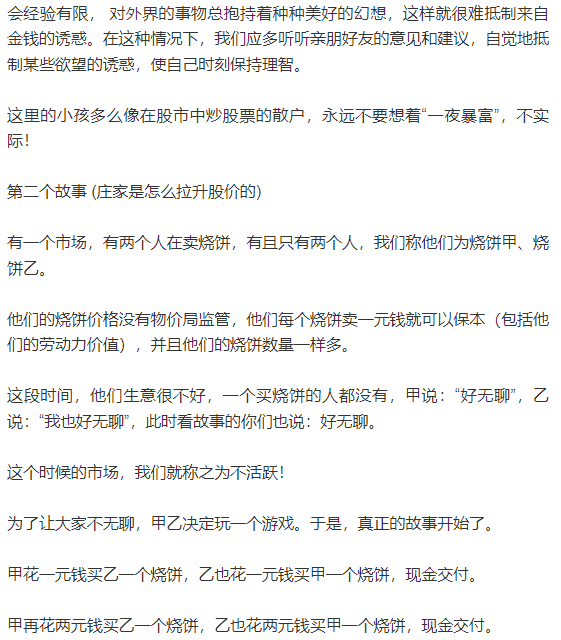 于是在整个市场的人看来(包括看故事的你)烧饼的价格飞涨,不一会儿就涨到了每个烧饼60元。但只要甲和乙手上的烧饼数一样,那么谁都没有赚钱,谁也没有亏钱,但是他们重估以后的资产“增值”了!甲乙拥有高出过去很多倍的“财富”,他们身价提高了很多,“市值”增加了很多。