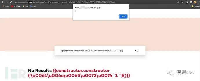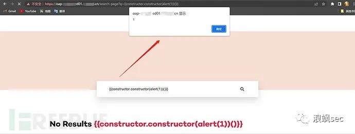 页面输出了乘法运算的结果,进一步验证确定存在Vue模板注入漏洞,成功弹窗: