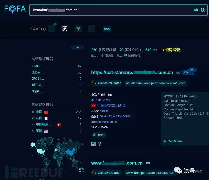那就收集旁站和子域名,可以使用工具像Layer,也可以用黑暗引擎像FOFA,SHODAN,笔者这里就用了FOFA收集: