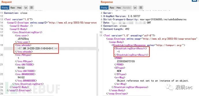 而随便输入一个不存在的数据,返回包中StocktakingStartResult 参数返回值为-1,由此可知接口调用成功返回值为0,失败为-1: