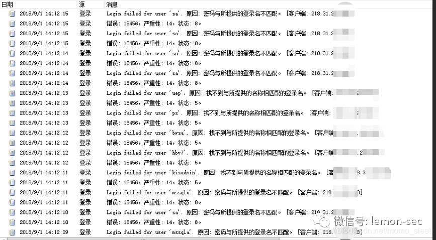 比如下对于mssql的sa用户暴力破解日志,里面也记录着客户端的IP地址如果没有配置相关的锁定策略在密码不够严格的情况下容易被攻陷。