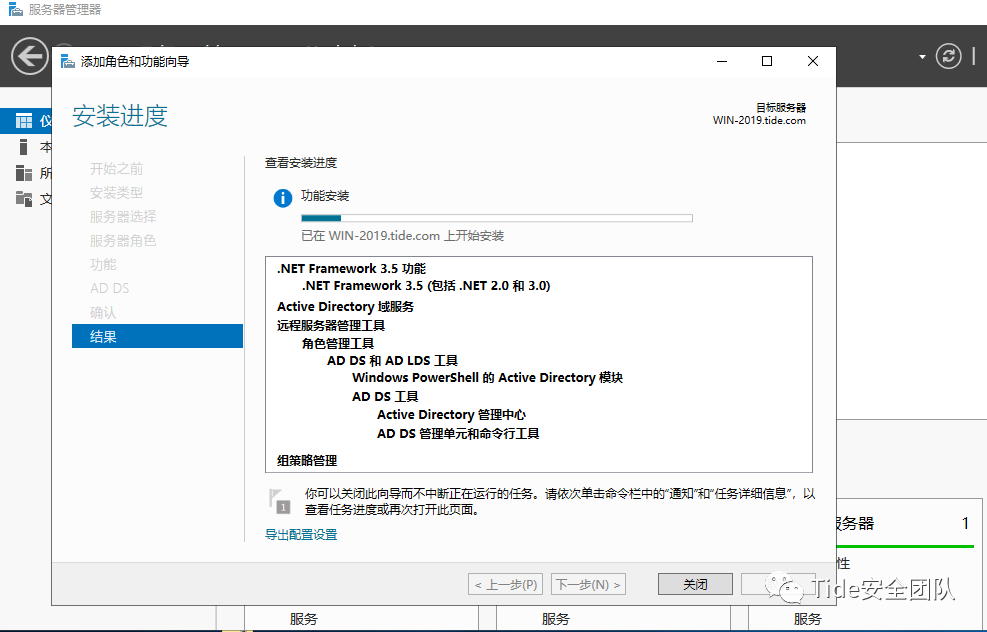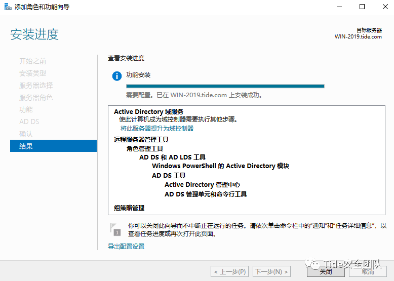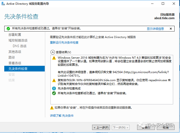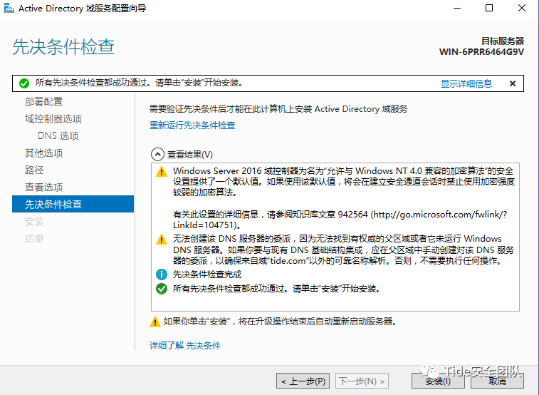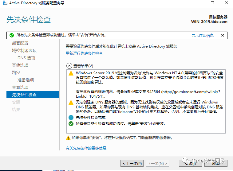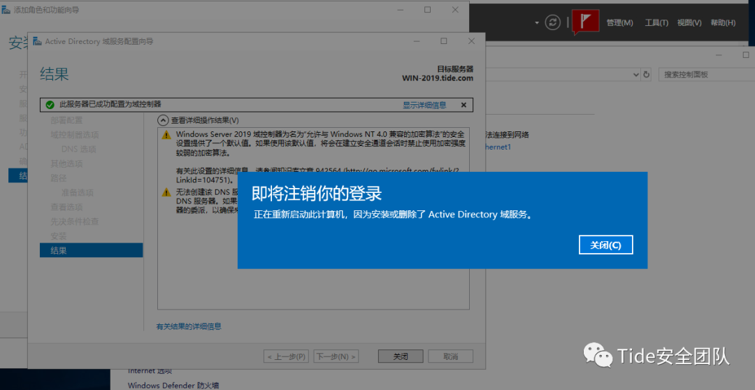 11,配置完成,完成域森林中的⽗域控制器(tide.com)的安装