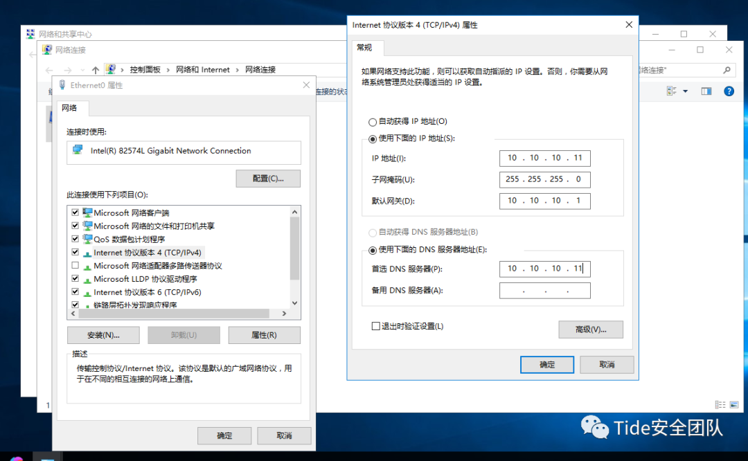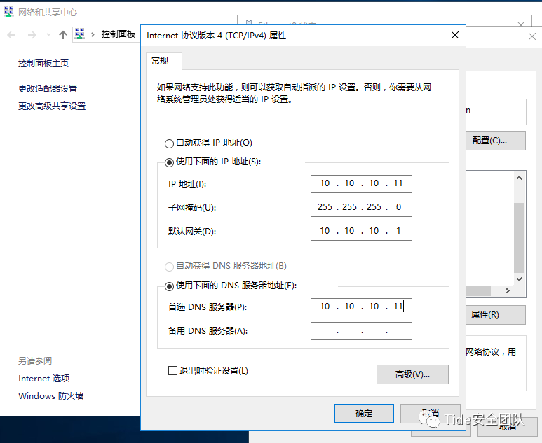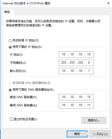 IP : 10.10.10.11子网掩码:255.255.255.0默认网关:10.10.10.1DNS:10.10.10.11(与IP一致)