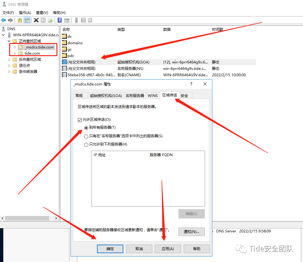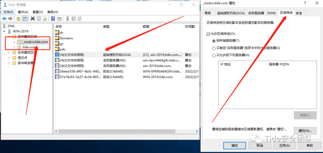 现在主域控制器和 DNS 集成,为了让后期搭建完辅域控制器的 DNS 同步主域控制器 DNS ,需要把主域控制器的 DNS 服务器_msdcs.tide.com和tide.com 的起始授权机构(SOA)区域传送设置成允许: