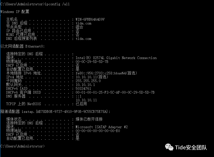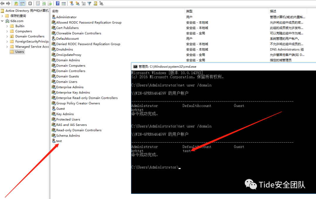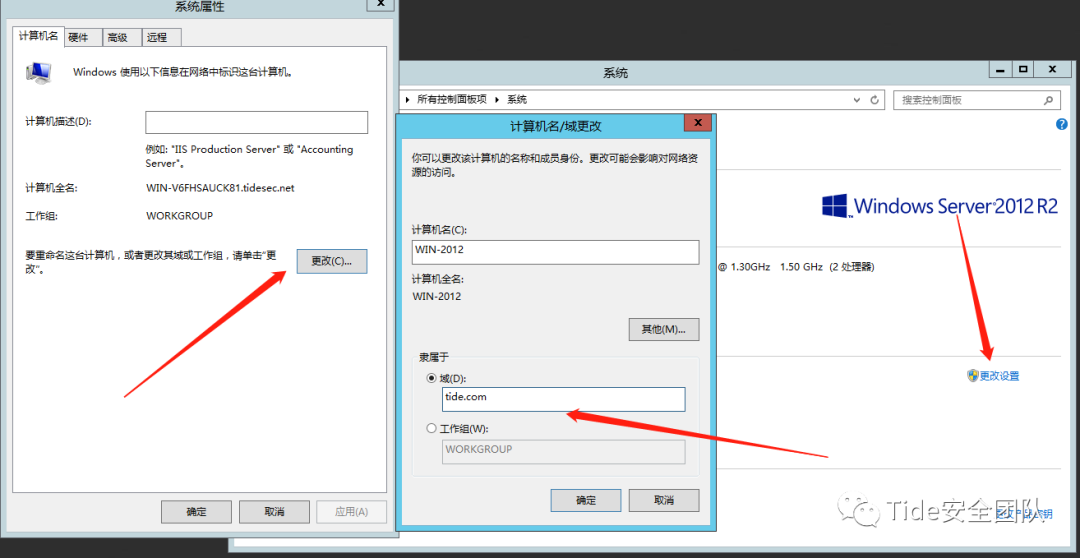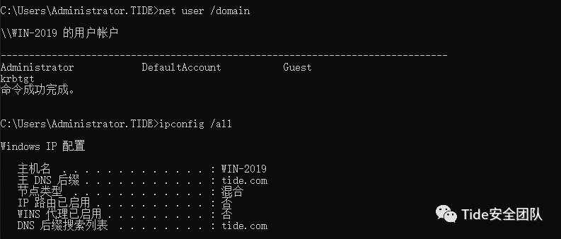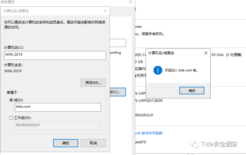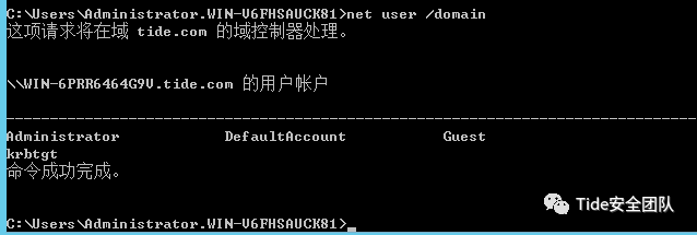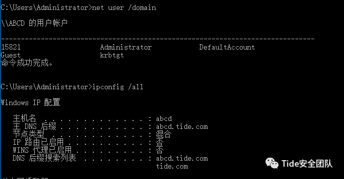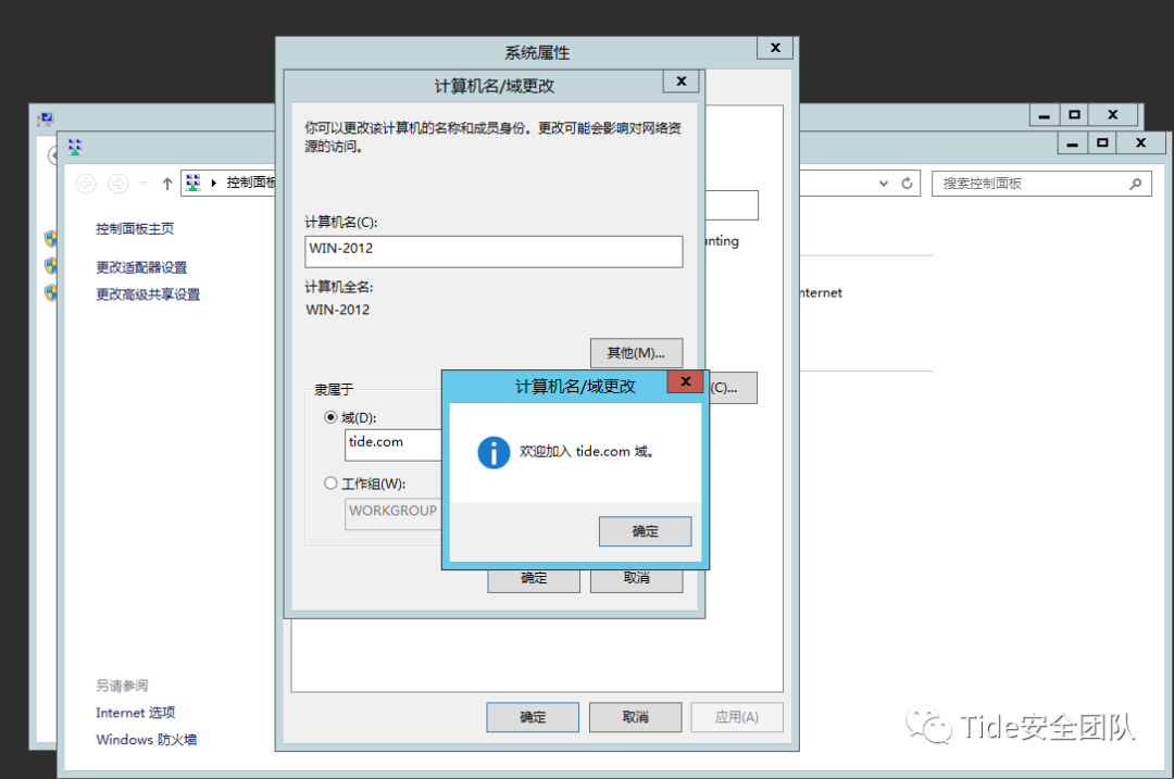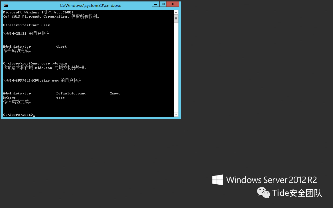4、Server 2012 成功加入父域tide.com(若cmd查询net user /domain时提示:“发生系统错误5,拒绝访问”,则按照步骤2重设计算机名即可)