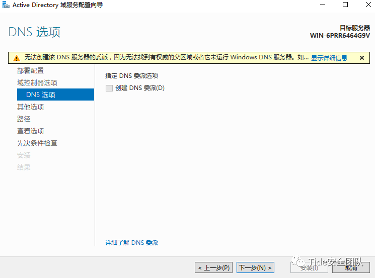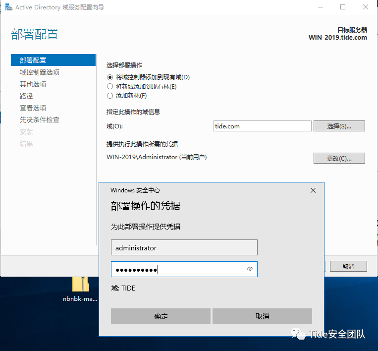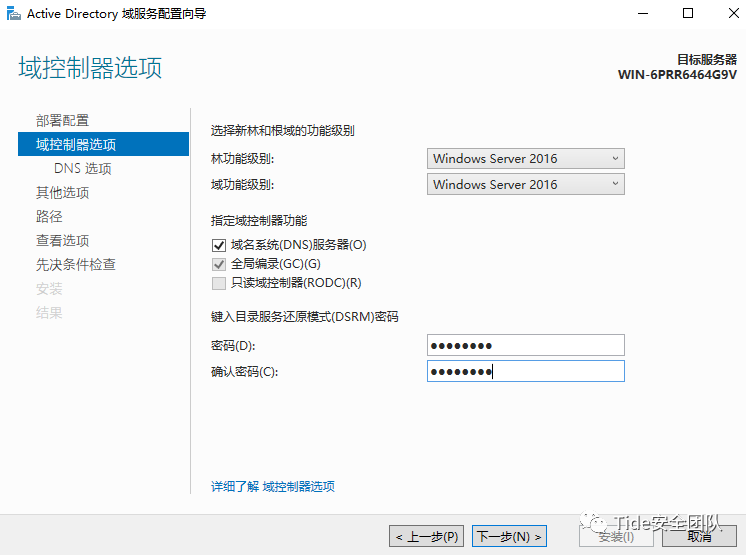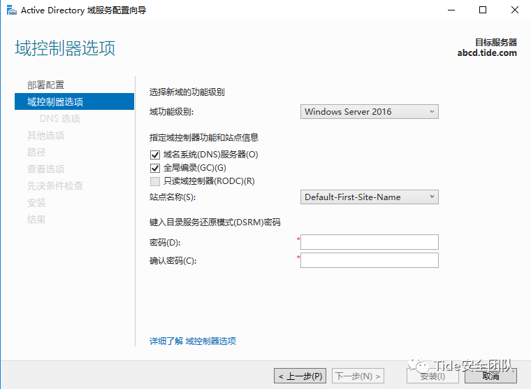 域功能级别:windows Server 2016指定域控制器功能和站点信息:域名系统(DNS)服务器 、全局编录填写新的DSRM密码:Tide.com