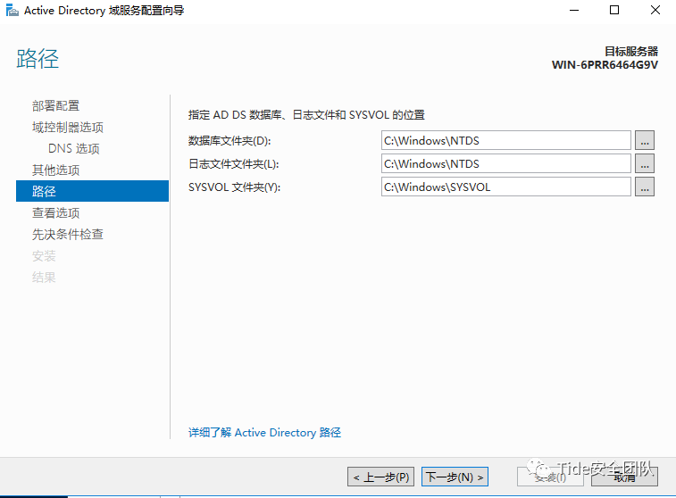 7、“NetBIOS域名”-“AD DS 数据库”、“日志文件”、“SYSVOL”默认选择下一步: