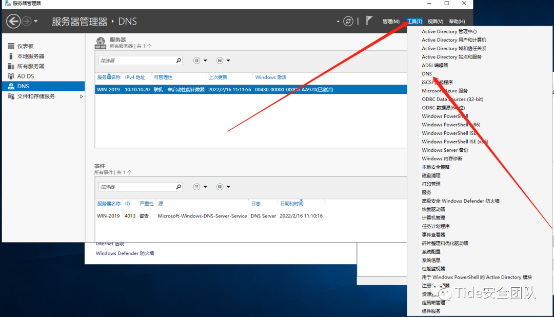 10、检查DNS服务器是否已获取到主域控制器传输过来的DNS服务器配置,检查正常后需要把辅域控制器的DNS服务器 msdcs.tide.com 和 tide.com 的起始授权机构(SOA)区域传送设置成允许