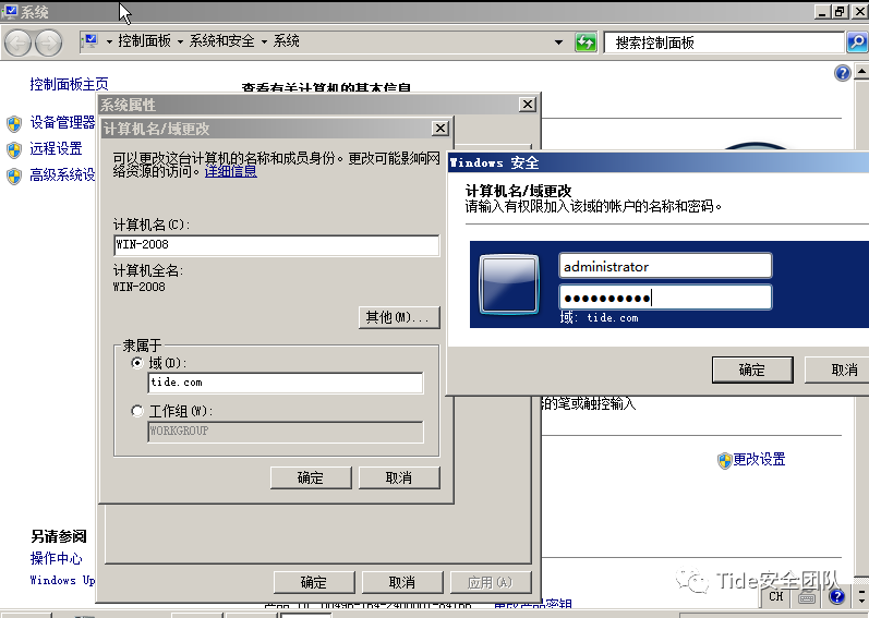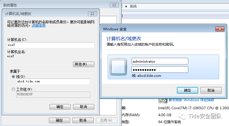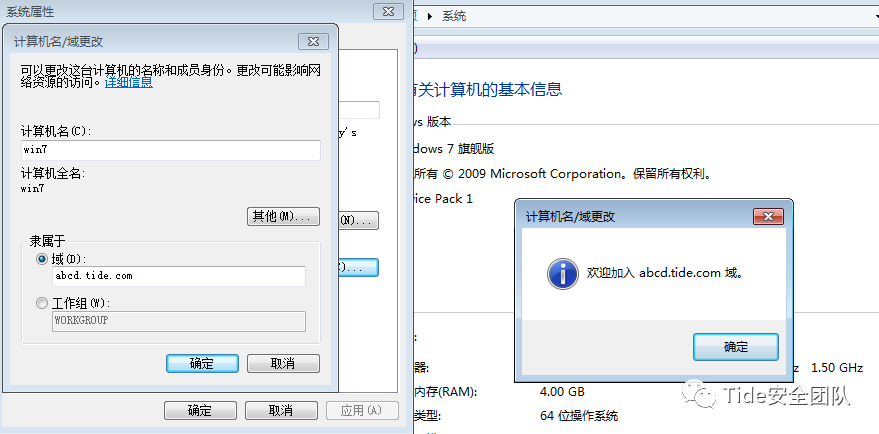2、修改主机名为:win7,这个时候加入域的域名就是:abcd.tide.com,账号密码需要输入子域控制器的密码