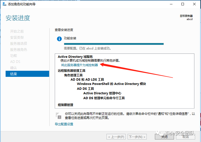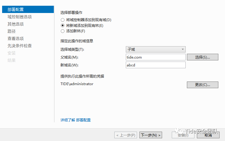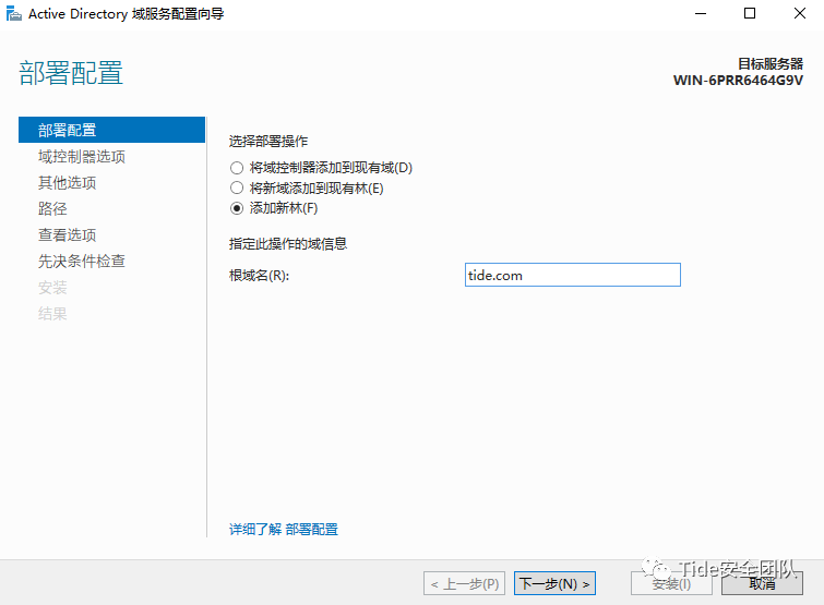 4、安装完成后选择“将此服务器提升为域控制器”-“添加新林tide.com”