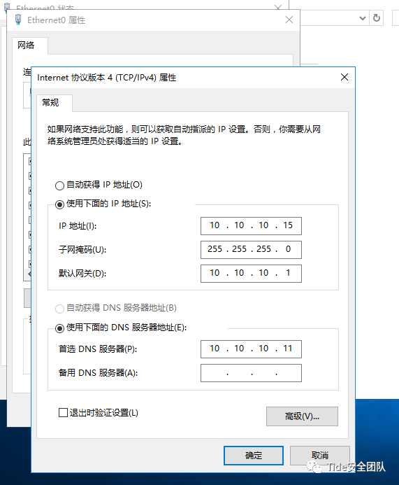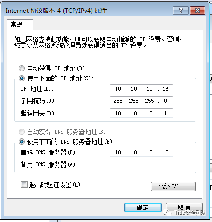 IP : 10.10.10.16子网掩码:255.255.255.0默认网光:10.10.10.1首选DNS服务器:10.10.10.15(子域控制器的IP)