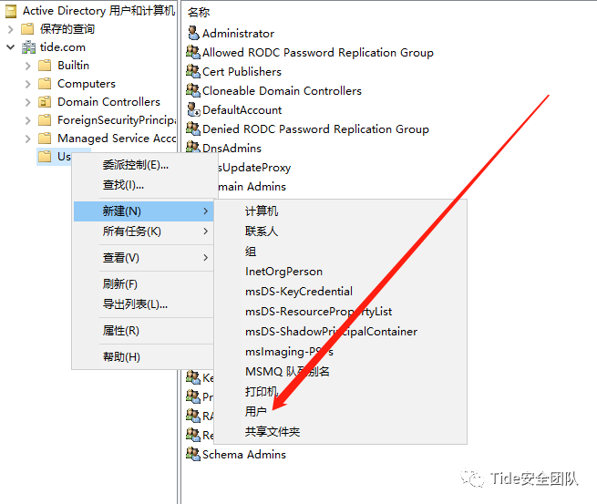 1、在主域的“Active Directory 用户和计算机”,选择“Users”-“新建”-“用户”
