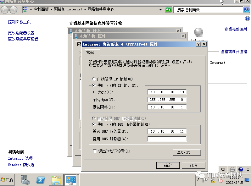 IP :10.10.10.13子网掩码:255.255.255.0默认网光:10.10.10.1DNS :10.10.10.11(也就是父域控的IP地址)
