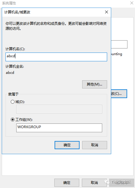 2、设置一下计算机名为:abcd,需要添加到域(原教程中不需要添加到域,但我进行至第4步时发现不添加到域无法进行下步操作,不知道什么原因)