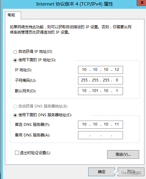IP : 10.10.10.12子网掩码:255.255.255.0默认网关:10.10.10.1DNS:10.10.10.11(也就是父域控制器的IP)