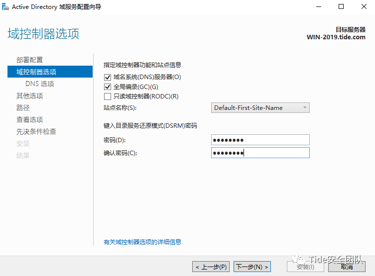 6、选择默认选择域名系统(DNS)服务器和全局编录,填⼊设置新的 DSRM 密码:Tide.com