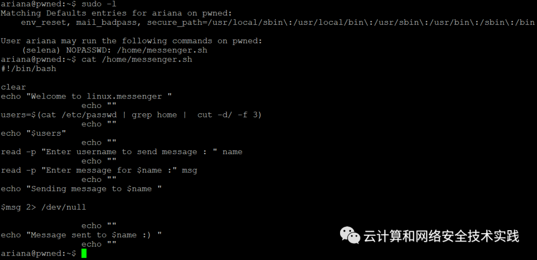 sudo -l查看到selena可以执行/home/messenger.sh,