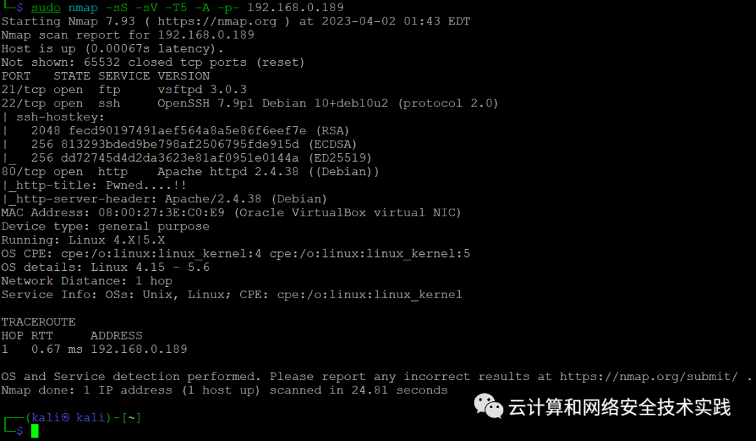 再继续做端口扫描,sudo nmap -sS -sV -T5 -A -p- 192.168.0.189,