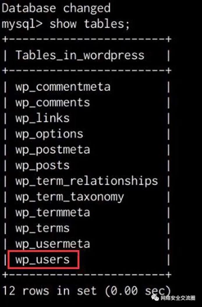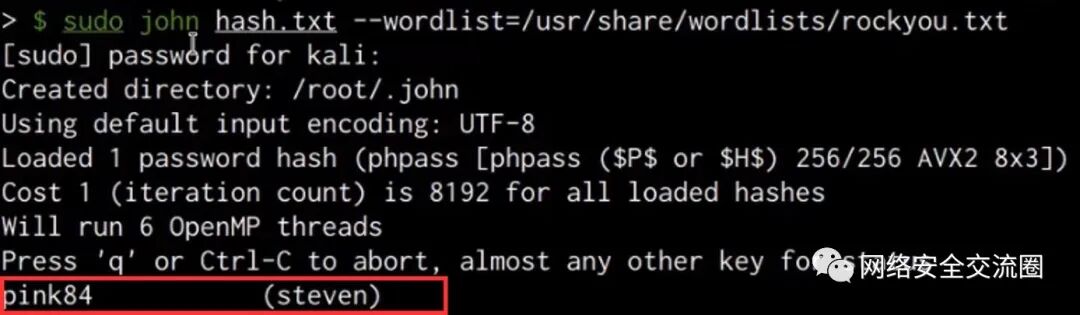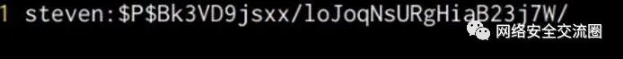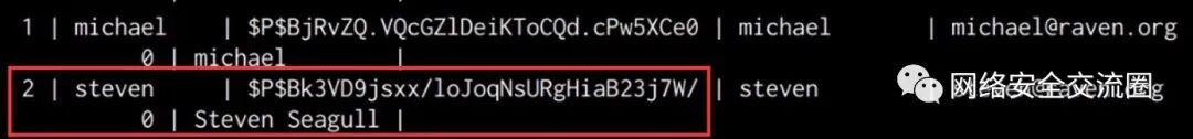 mysql -u root -puse wordpress; show tables; select * from wp_users;在这种情况下,WordPress使用MD5哈希算法加密了密码,因此,我们需要破解哈希以获得用户“steven”的明文密码。