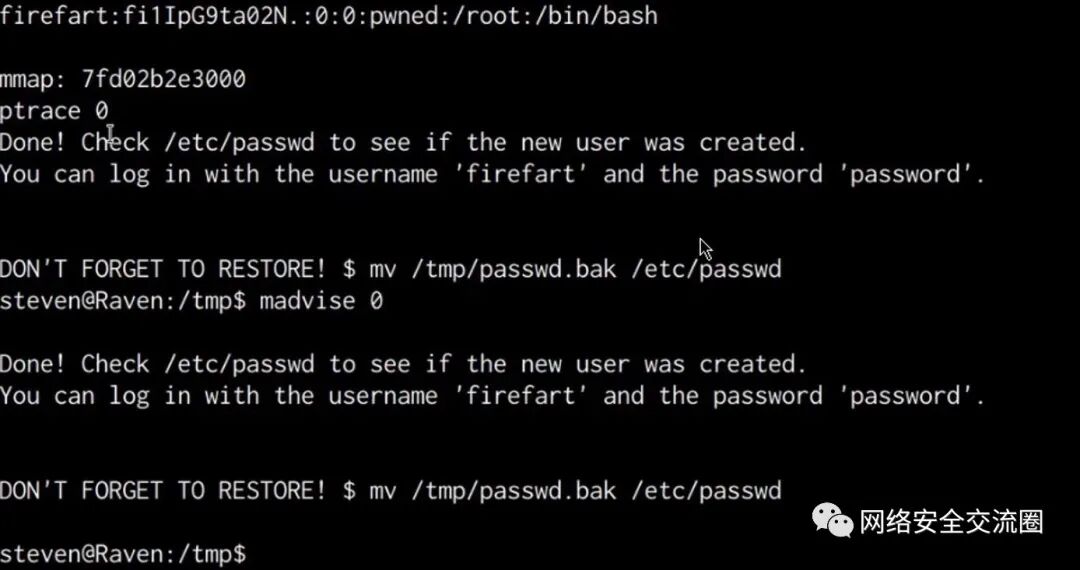 在这种情况下,检查/etc/passwd文件的内容不会显示任何名为“firefart”的用户帐户,因此,我们可以推断此内核漏洞利用失败,无法为我们提供提升的用户帐户。
