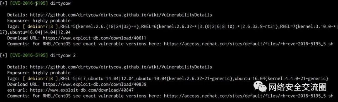 /tmp/les.sh结果基于成功概率对漏洞进行排序,其中首先列出的漏洞提供了最高的成功机会,在这种情况下,我们能够将“dirtycow”漏洞识别为良好的候选者,因为它满足分布和内核版本要求。