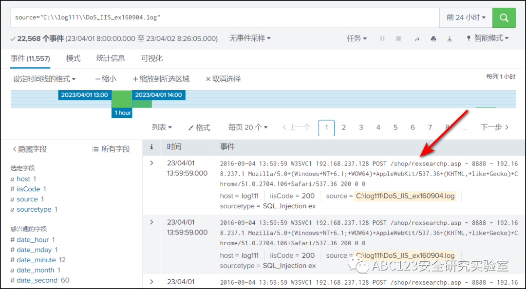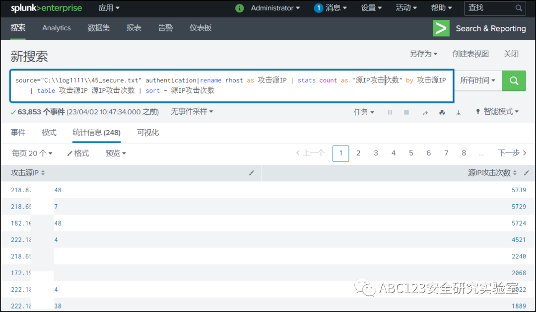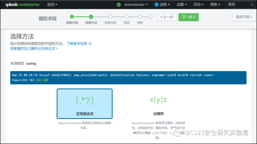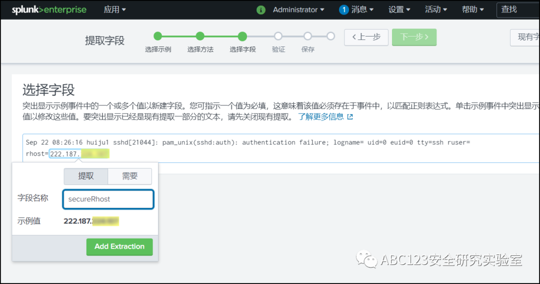 接下来我们需要统计一下攻击者使用了哪些源IP地址,因此我们要从日志中把源IP地址作为一个字段提取出来,Splunk很方便地给我们提供了提取字段的功能,看接下来的操作: