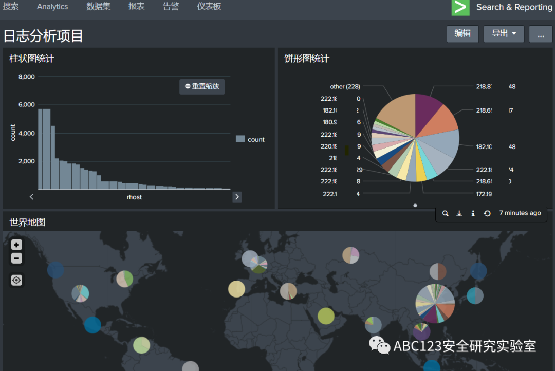 通过Splunk可以将各种分析图表汇总到“仪表板”上进行展示,以下是我做的一个展示,将3个分析图表汇总到一个界面中,具体使用方法后续再讲。
