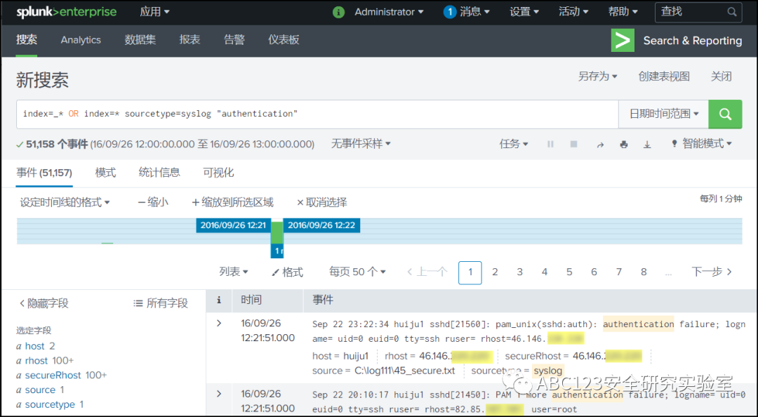 如下图所示,为了分析SSH口令枚举事件,直接在搜索框中填入“authentication”关键字,Splunk分析完毕后给出了一个柱状图,每个柱状图代表1分钟内的SSH口令攻击次数。根据Splunk的柱状图并适当调整时间轴长度,可以直观看到,该日志中暴力破解SSH密码行为主要集中在12点21分到12点22分这一分钟内,攻击者进行了总共5万1158次密码枚举操作。