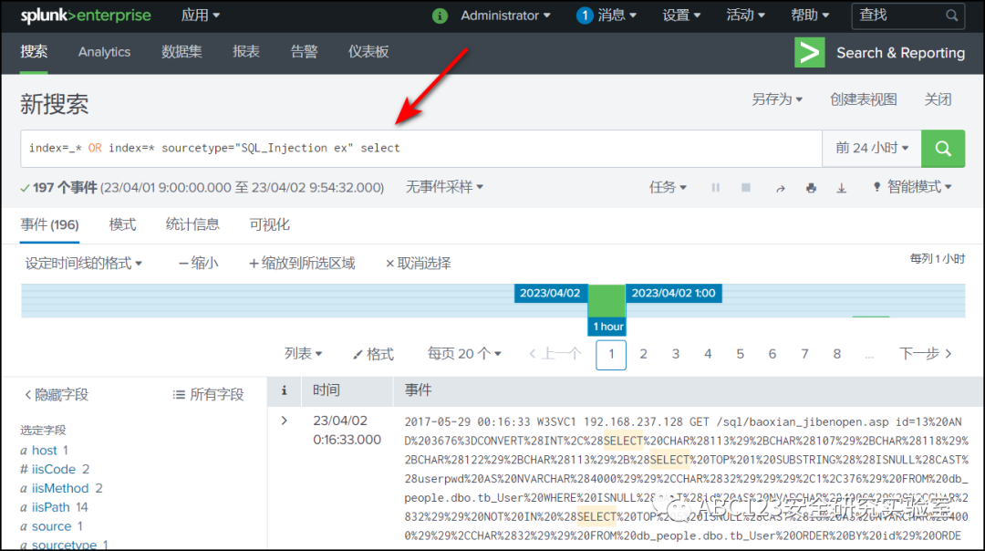 使用如下语句,可以快速检索SQL注入攻击行为,为了减少误报,可以配合使用AND语句拼接IISCode!=404,排除响应码为404的搜索结果。如下图所示,结合柱状图可以知道,SQL注入攻击主要集中在柱状图所示的一个小时左右的时间段内,推测攻击者发现了sql注入漏洞,并实施了攻击。这里仅用了一个select关键字,因为攻击者想要使用sql注入漏洞去脱数据的话,select关键字几乎是必用的。