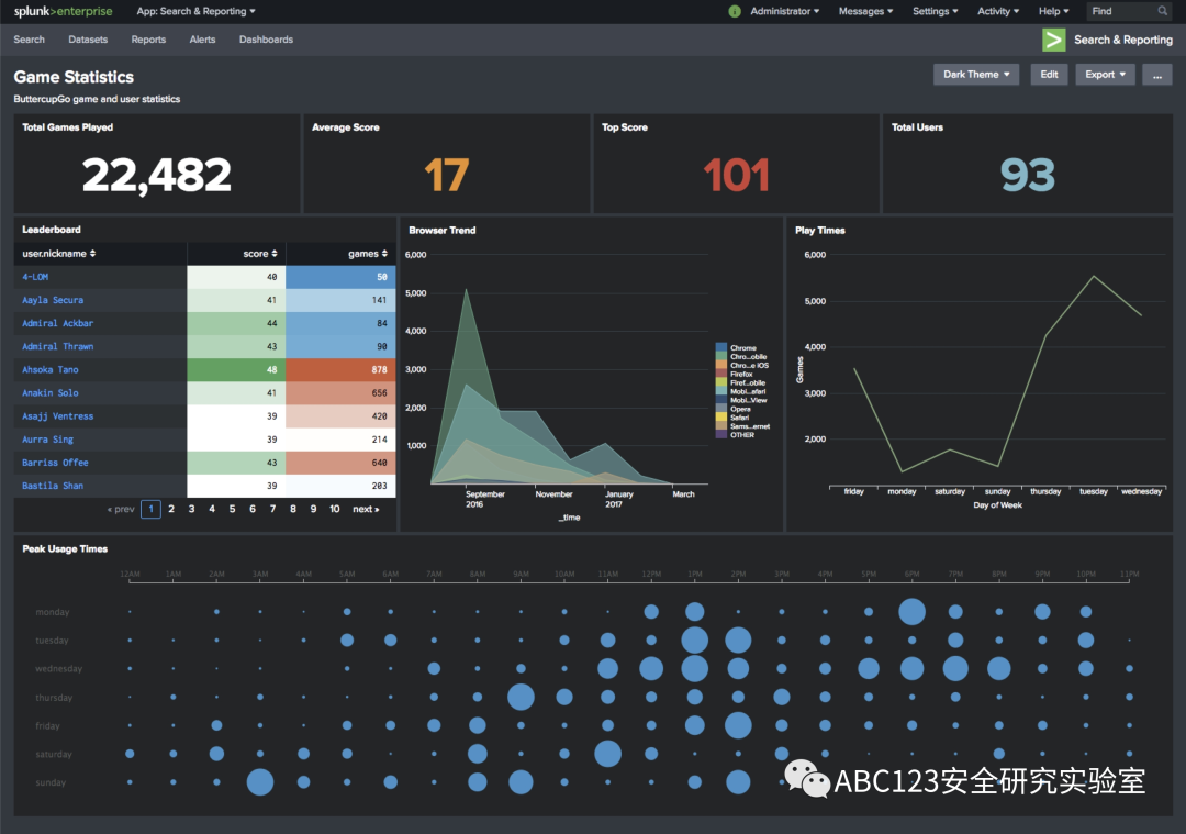 大家好,我是ABC_123。我曾经花费时间搭建各种Web服务器、数据库环境去研究分析日志,使用的工具从使用系统自带命令去分析日志,到自动化的360星图,再到后期的Logparser、ELK(ElastiSearch、Kibana、Logstash)等等。到最后我发现还是Splunk这款商业版工具用起来更顺手一些,我个人认为这款软件比ELK要好用得多,只不过ELK免费开源可以包装成产品,所以受到大家追捧,反之Splunk价格昂贵,推广就很受限制。把Splunk用好了足以应付现有的各种日志分析场景,堪称一款神器。
