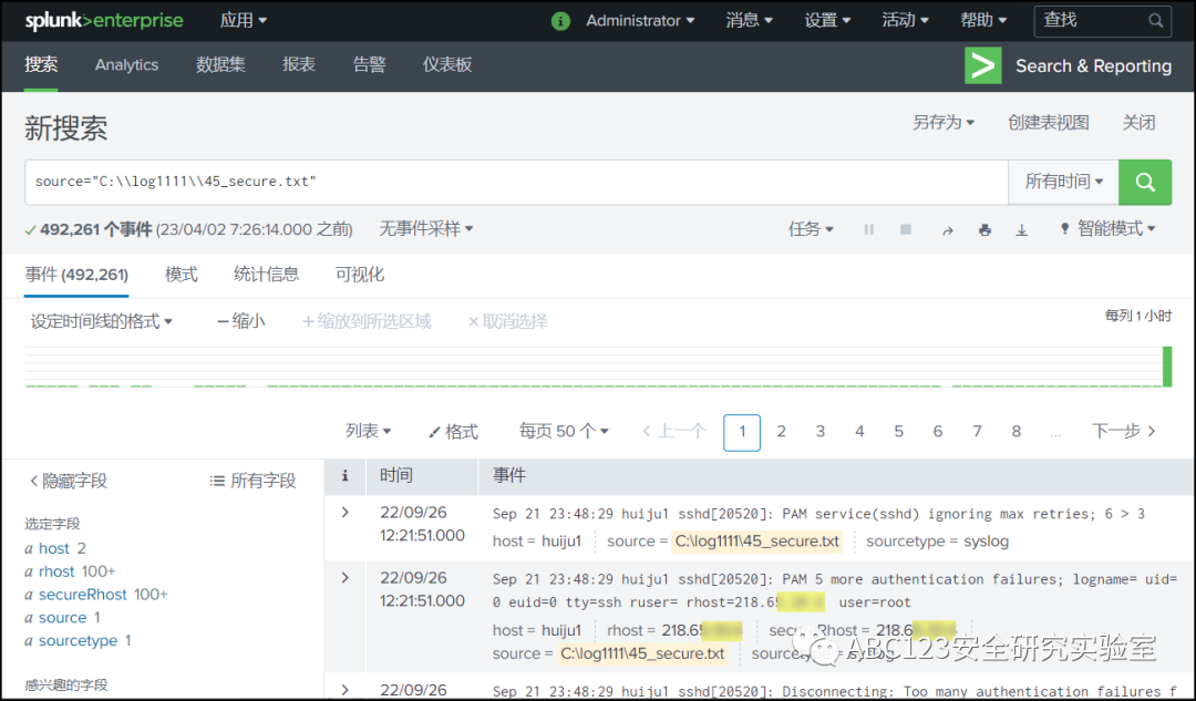 如果需要对指定的日志文件进行日志分析,则只需要输入以下命令即可:source="C:\\log1111\\45_secure.txt"
