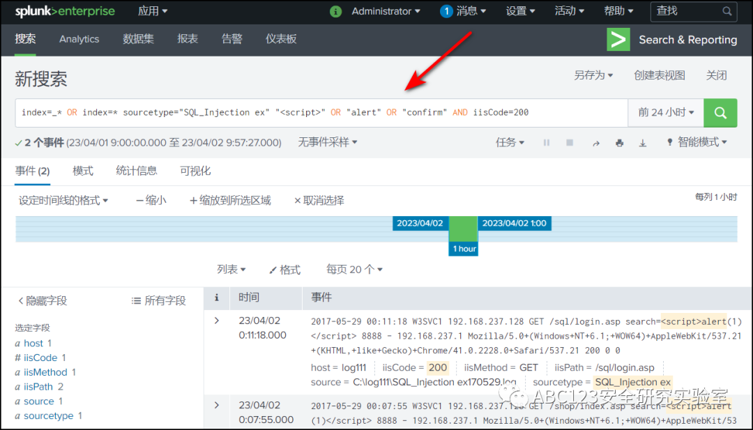 使用如下语句,可以快速分析XSS攻击行为,通过逻辑运算符AND筛选响应码为200的日志结果,Splunk可以支持<、>等标签字符的分析,使用的时候需要把关键词加上双引号。