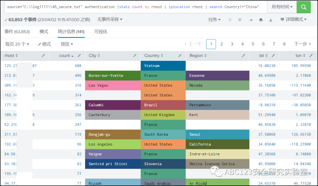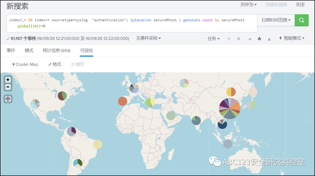 接下来以图表形式展示ip地址的分布,输入命令 "authentication"| iplocation secureRhost | geostats count by secureRhost globallimit=0 ,可以看到,攻击者很有可能动用了僵尸网络或者是代理池在一分钟左右的时间里,进行了6万多次的账号枚举操作。