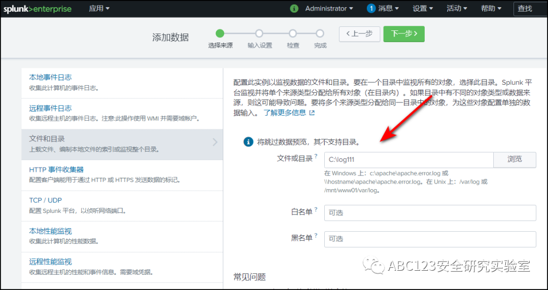 Splunk导入日志文件的方法有很多,我比较习惯用以下方式导入日志,具体操作如下:设置-->数据输入--> 文件和目录-->新本地文件和目录