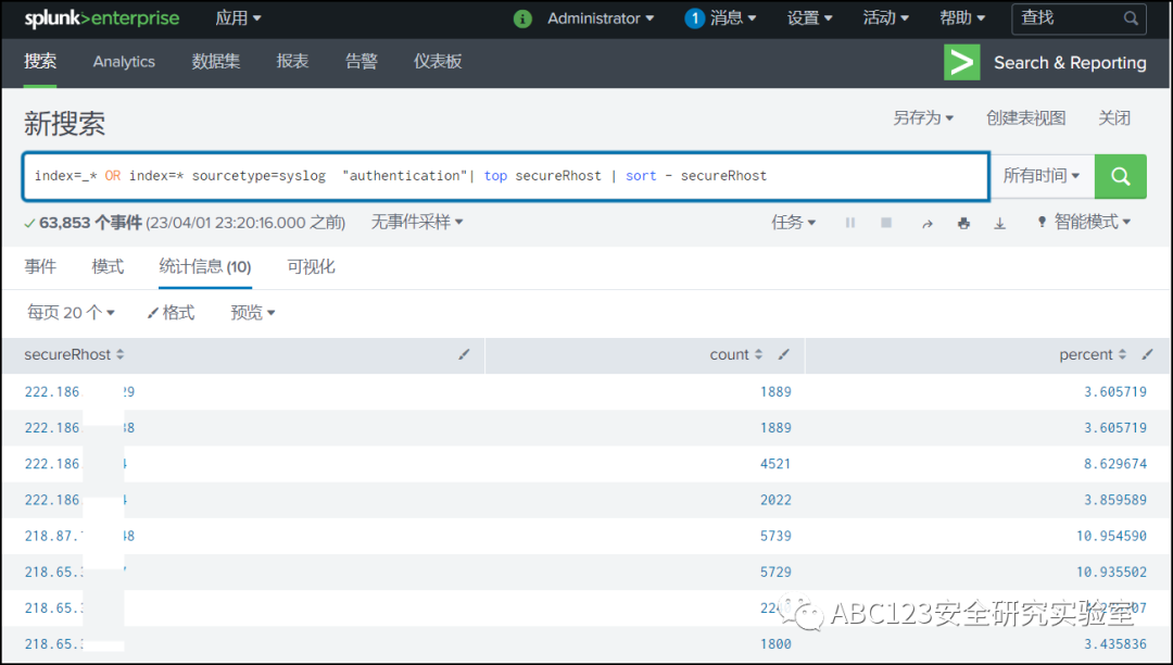 接下来输入查询语句 "authentication"| top secureRhost | sort - secureRhost,可以直观看到哪些ip地址爆破次数最高。这里需要注意管道字符|的用法,左侧输出,右侧输入。