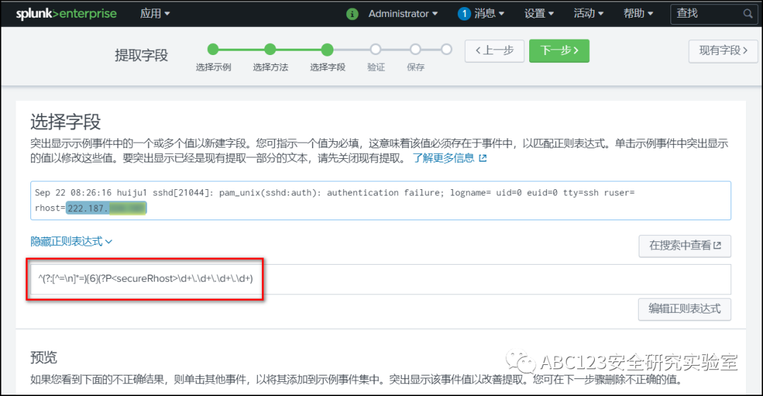 添加完成之后,发现Splunk自动给我们做好了正则表达式语句,可以根据需要进行修改。