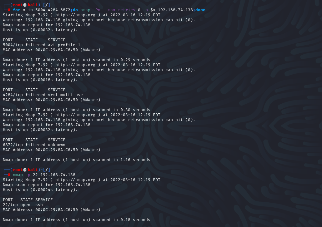 for x in 5004 4284 6872;do nmap -Pn --max-retries 0 -p $x 192.168.74.138;donenmap -p 22 192.168.74.138