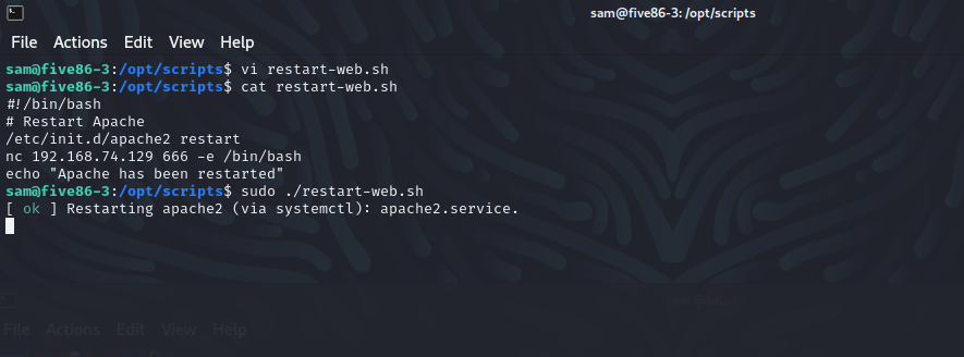 ssh -l sam 192.168.74.138sudo -l发现有个脚本文件,是一个重启apache的脚本