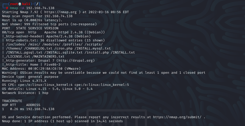 nmap -sn 192.168.74.0/24对目标主机做进一步的扫描