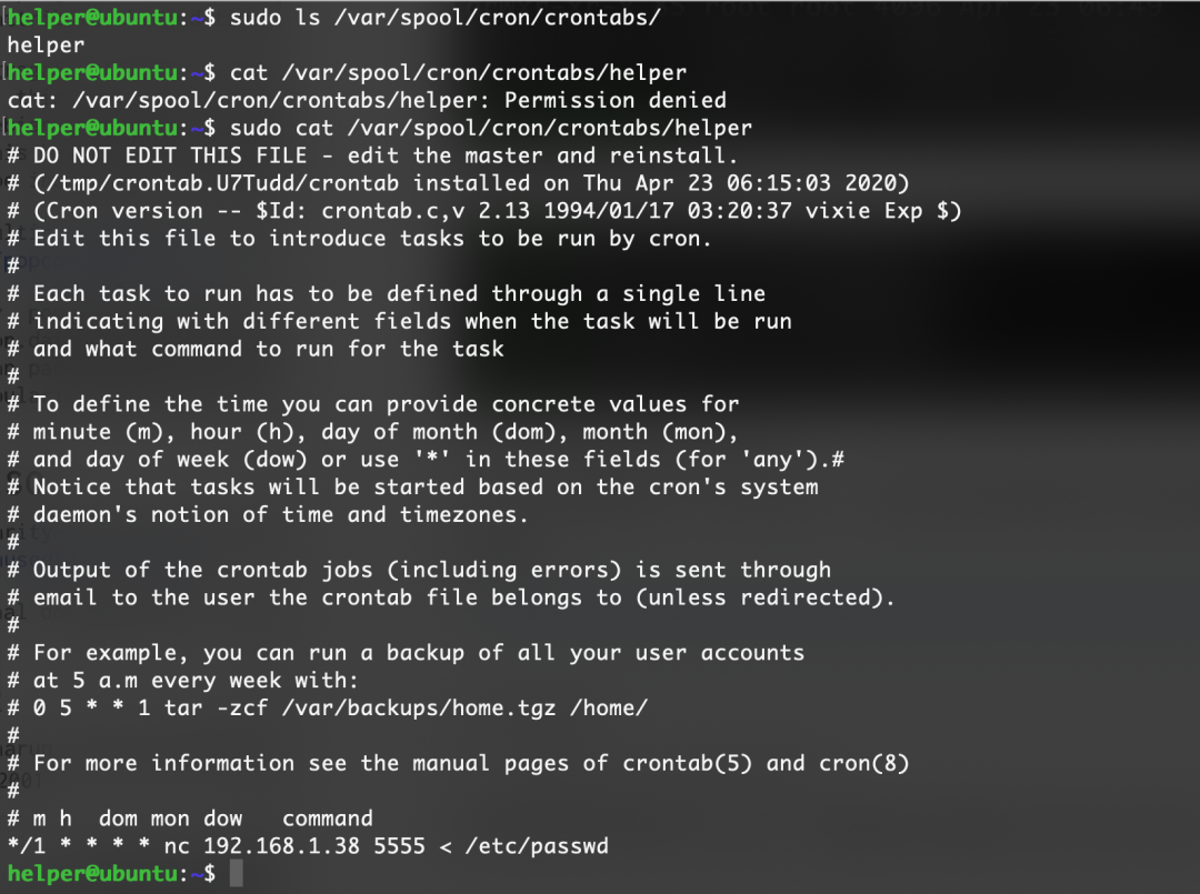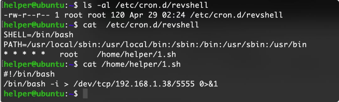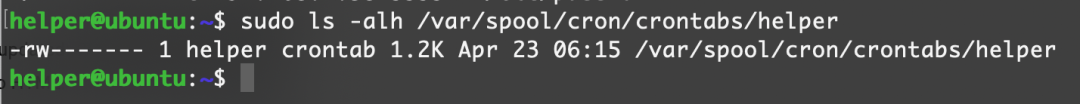 这个文件权限还是蛮高的,默认都不允许进行查看,可以看到,这个就是我们 crontab -e 编辑的文件,这也证实了我们之前的猜想