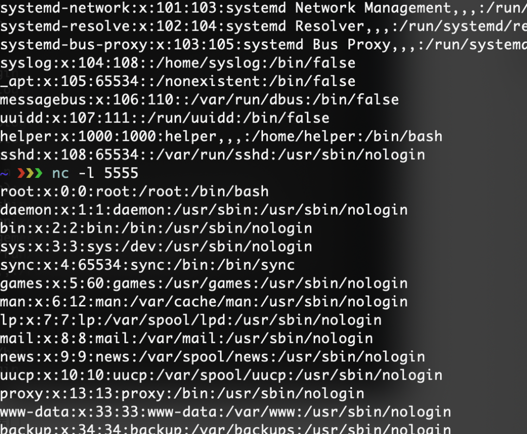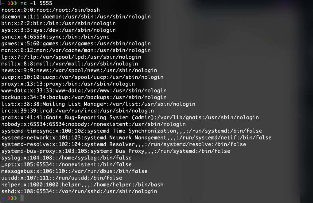 成功获取到目标主机传输过来的文件,再次监听5555端口