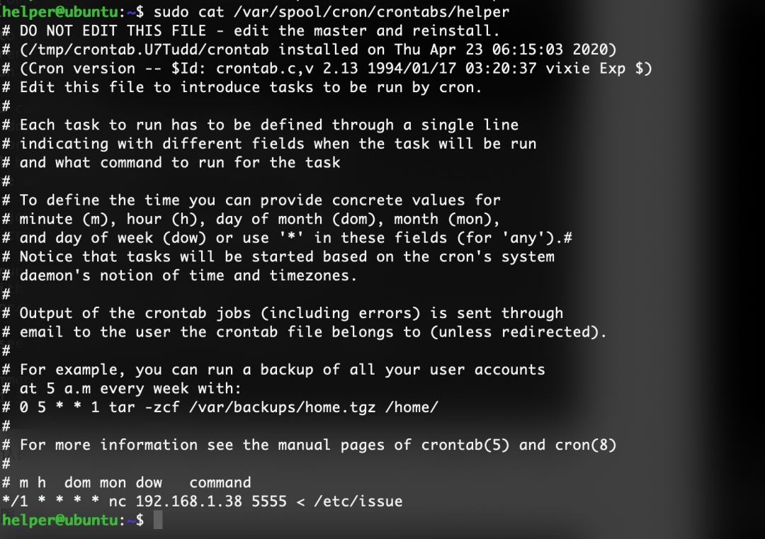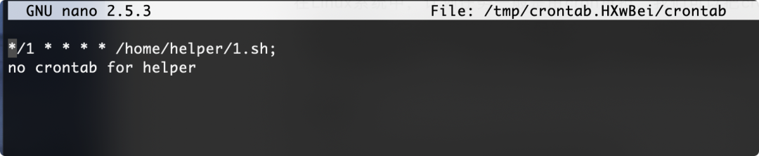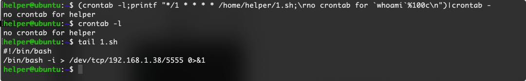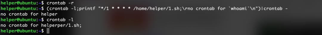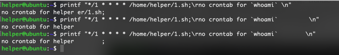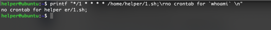 printf "*/1 * * * * /home/helper/1.sh;\rno crontab for `whoami`\n"