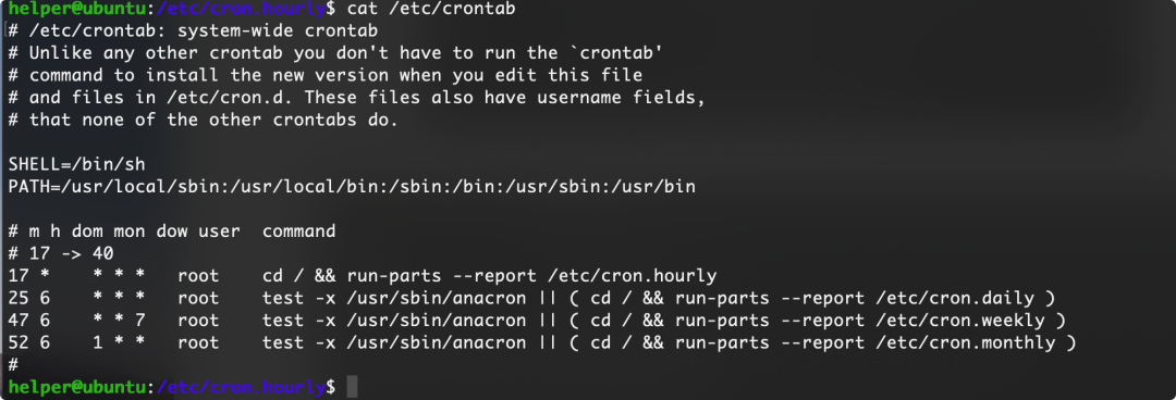 可以看到系统默认的计划任务中就有 cd / && run-parts --report /etc/cron.hourly ,这条命令的含义就是执行/etc/cron.hourly/ 下的所有的可执行文件